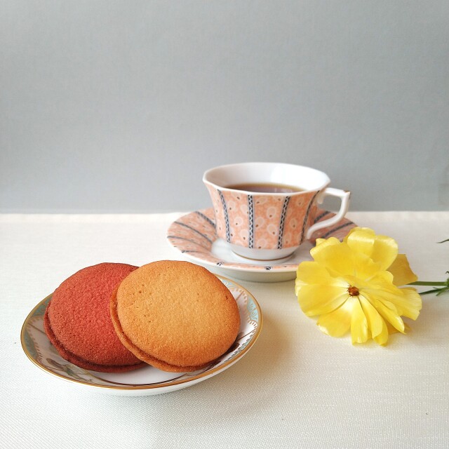 サックリとした厚みのあるクッキーに、プレーンといちごの2種類のクリームをたっぷりと挟んだサンドクッキーです。